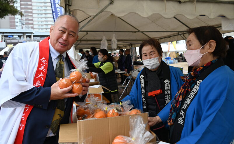 奄美大島 瀬戸内町観光物産展in尼崎(主催:瀬戸内町 共催:関西瀬戸内会)が、2月14日(土)15日(日)阪神尼崎駅中央公園噴水広場にて開催された。この日は、瀬戸内町から、取れたてのタンカン2トンの他、黒糖製品、キビ酢、ドレッシング、ジャム