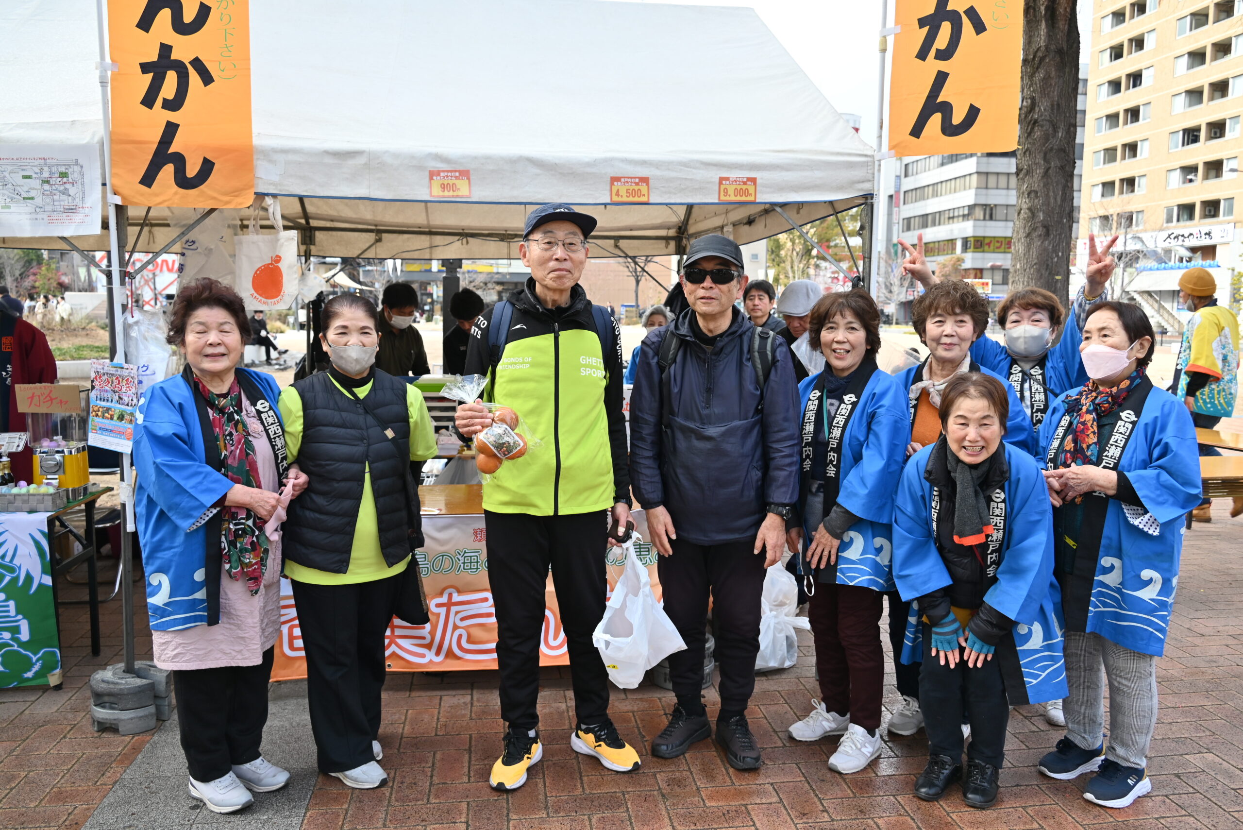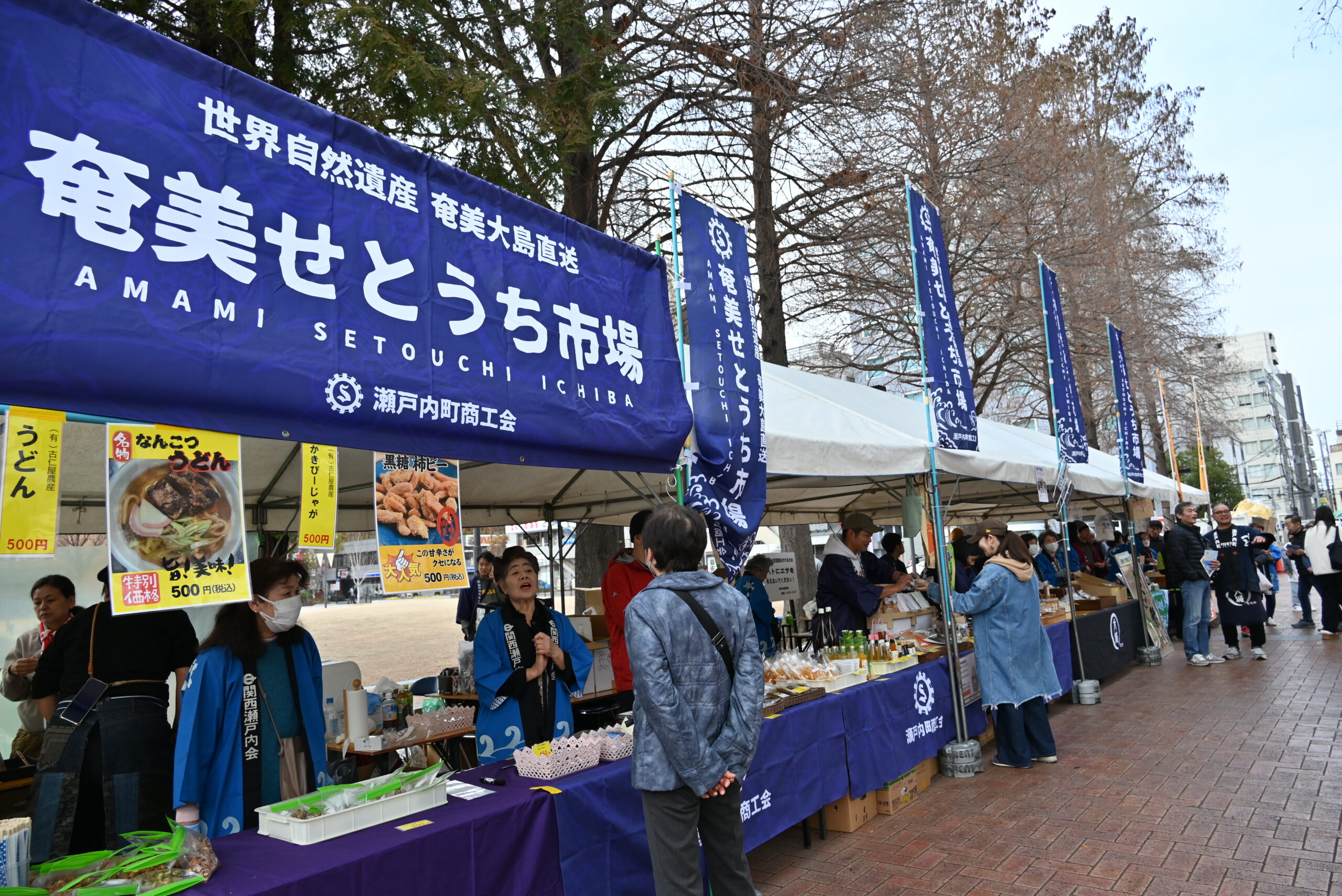 この日は、瀬戸内町から、取れたてのタンカン2トンの他、黒糖製品、キビ酢、ドレッシング、ジャム、大島紬製品、よもぎ餅等菓子類、海産物等瀬戸内町の食材使った加工食品等の特産物、島の味を楽しめるの飲食物、観光案内等8つのブースに、鎌田愛人瀬戸内町町長をはじめ35人が、町から訪れた。