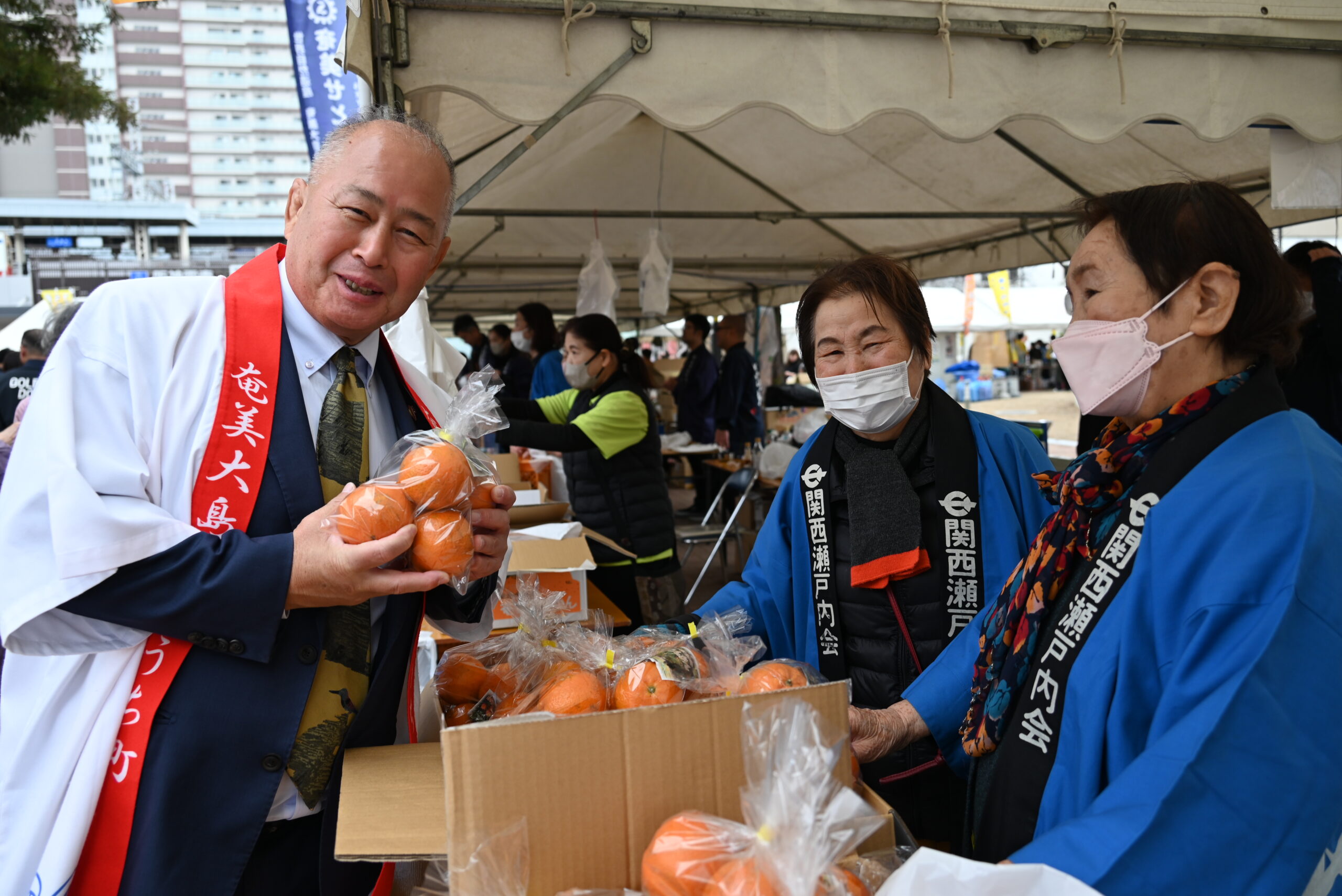 この日は、瀬戸内町から、取れたてのタンカン2トンの他、黒糖製品、キビ酢、ドレッシング、ジャム、大島紬製品、よもぎ餅等菓子類、海産物等瀬戸内町の食材使った加工食品等の特産物、島の味を楽しめるの飲食物、観光案内等8つのブースに、鎌田愛人瀬戸内町町長をはじめ35人が、町から訪れた。