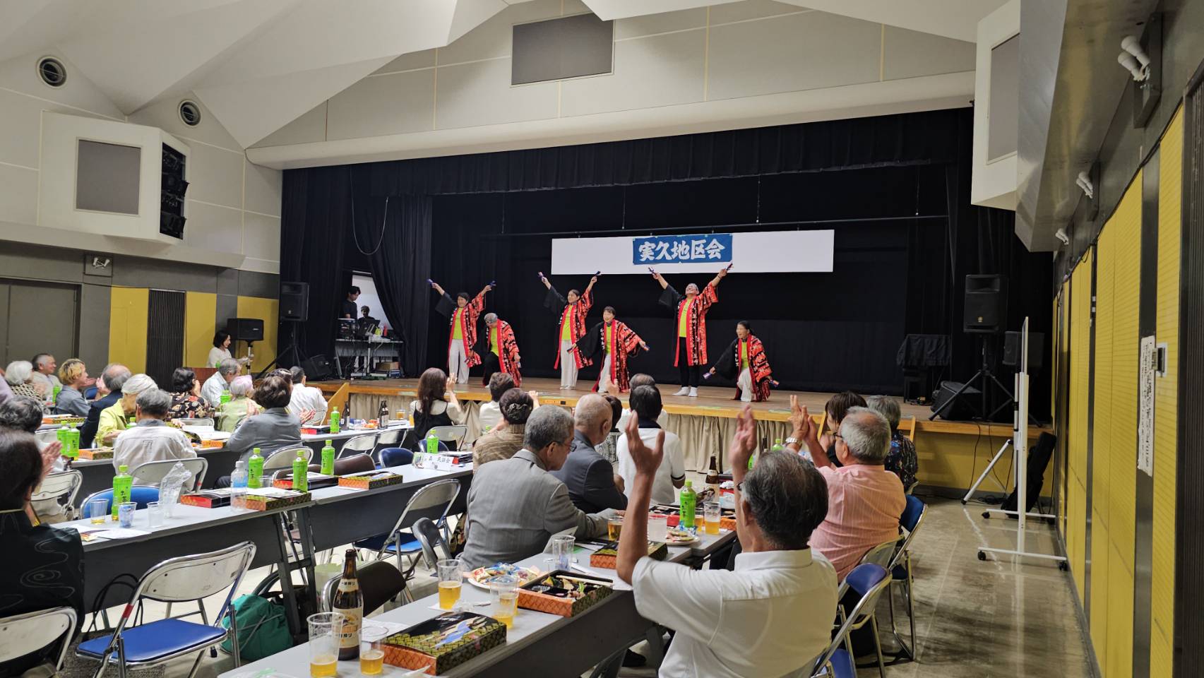 守屋不二男さんの祝唄、若柳吉有彌さん率いる奄美舞踊むつみ会の祝舞が披露され、岩井吉子前女性部長の音頭で乾杯、歓談後、二部の親睦会へ。
